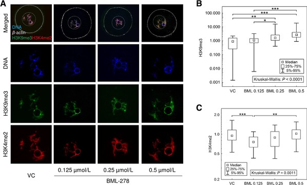 在(0.25和0.5)μmol/L BML-278处理下,H3K9三甲基化增强;在0.125μmol/L BML-278处理下,H3K9二甲基化降低。