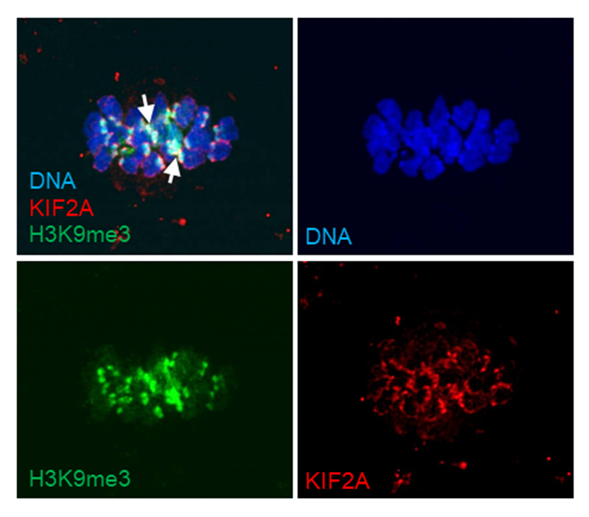 着丝粒相关的驱动蛋白KIF2A和H3K9共染色结果