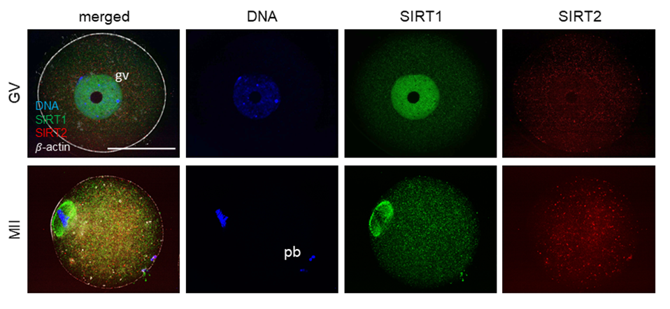SIRT1是酵母Sir2的哺乳动物同源物,属于NAD+依赖性组蛋白脱乙酰酶(也称为sirtuins),SIRT1在卵母细胞中作用的确切机制尚未研究,不过有许多直接的参与表观遗传的SIRT1底物,如H3K9、H4K16等,药物性SIRT1激活是提高卵母细胞活力的一种可能途径。