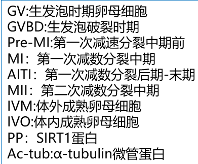 SIRT1只存在于未成熟GV期卵母细胞,核膜破裂(NEBD)后SIRT1信号立即稀释在在卵母细胞的细胞质中,并最终在成熟MII卵母细胞中形成纺锤状模式,与卵母细胞中的其他组蛋白去乙酰化酶表现一致。
