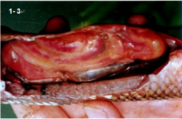 (3)“肠炎”型:以肠道充血、出血为主,肠道全部或局部呈鲜红色。