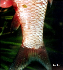 病鱼体表局部或大部鳞片脱落,出血发炎,特别是鱼体两侧和腹部最为明显。鳍的基部或整个鳍充血,并出现“蛀鳍”。