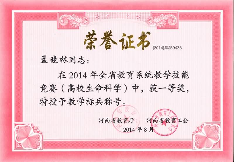 由河南省教育厅、河南省教育工会联合举办的“河南省2014年教育系统教学技能竞赛”结果日前揭晓,本团队孟晓林博士荣获一等奖(高校生命科学)并被授予“河南省教学标兵”称号。