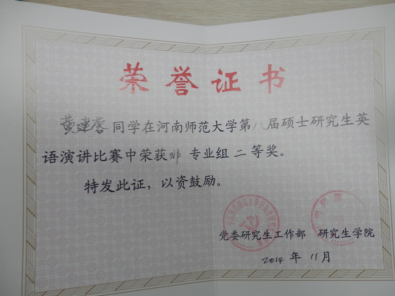 祝贺我团队2014级研究生黄建蓉在第八届研究生英语演讲赛中荣获非专业组二等奖!