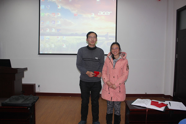 图5,秦超彬老师给孙君君发奖(由于孙君君已毕业,由郑文佳代领),孙君君同学在《水产科学》发表论文1篇,获得奖励500元。