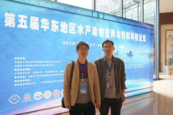2016年3月27日-3月29日,第五届华东地区水产动物营养与饲料科技论坛在江苏无锡召开。本次会议主办单位是中国水产学会水产动物营养与饲料专业委员会和中国水产科学研究院淡水渔业研究中心。本次论坛以“新常态下水产饲料安全及可持续发展”为主题,共有来自各高校、研究所及企业代表500余人参会。我团队秦超彬博士、2014级研究生杨峰参加了此次会议。