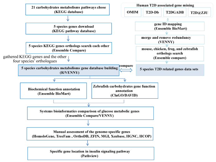 在本研究中,我们首先构建了包含791(斑马鱼),593(非洲爪蟾),523(鸡),666(小鼠)和698(人类)个基因的碳水化合物基因数据库;功能注释分析发现超过57%的糖代谢基因与人类的2型糖尿病有关。系统生物学比较分析发现,发现超过70%的碳水化合物/葡萄糖代谢基因在五个物种中非常保守。有趣的是,我们发现了有4种斑马鱼特异性基因(si:ch211-167b20.8,CABZ01043017.1,socs9和eif4e1c)和1个人类特异性基因(CALML6)。进一步分析发现,这5个基因都位于胰岛素代谢通路中。同时,为了便于同行有效地利用和提取该文中的所有数据,我们构建了一个葡萄糖代谢数据库在线平台(http://101.200.43.1:10000/)。
