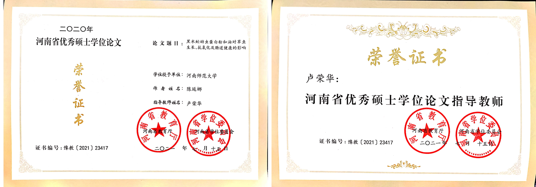 近日,2020年河南省优秀博士、硕士学位论文评选结果揭晓。经省外同行专家评审,共有26篇博士学位论文和219篇硕士学位论文入选。本团队陈延娜同学的论文“黑水虻幼虫蛋白粉和油对草鱼生长、抗氧化及肠道健康的影响”入选2020年度河南省优秀硕士论文。
