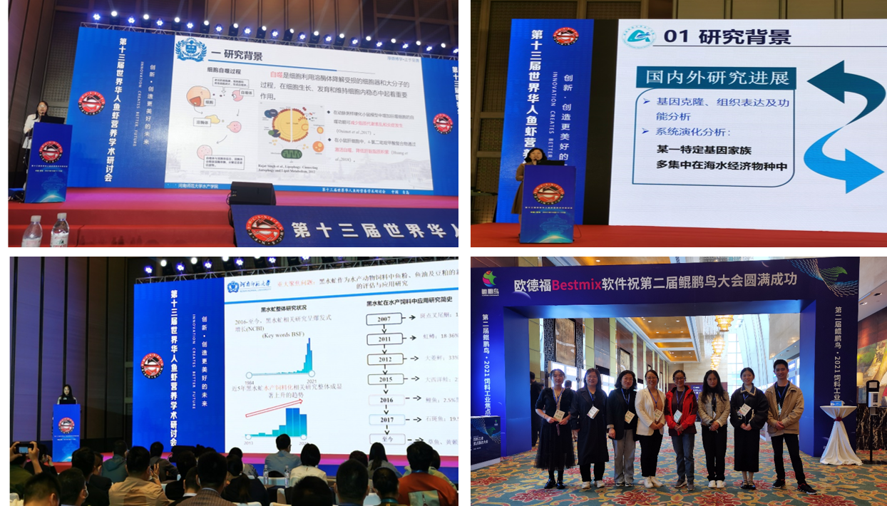 团队卢荣华副教授、张玉茹副教授及徐歆歆博士分别在会上做了题为《miR-33 调节草鱼 CIK 细胞自噬及免疫功能的研究》《淡水经济鱼类中脂肪酸去饱和酶基因超家族的全基因组鉴定与比较分析》及《黑水虻油在不同脂肪水平日粮中对框鲤幼鱼生长、健康及脂肪酸组成的影响》的报告。此外,团队师生充分利用外出学习机会,还参加了“第二届鲲鹏鸟·2021饲料工业焦点融合大会”(详情请查看学院网页//www.ldvrms.com/scxy/2021/1020/c6035a222054/page.htm)。