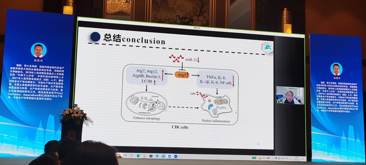 本次会议围绕脂质生理代谢与调控机理、脂质精准营养需求、脂质健康与品质形成调控、新型脂肪源安全评估与应用等四个方面共计开展32个报告,报告内容多种多样,学术成果大开眼界,学术思想值得深思。团队卢荣华教授通过线上的方式分享了题为“miR-33靶向Atg5调节草鱼CIK细胞自噬和免疫功能的研究”的报告。