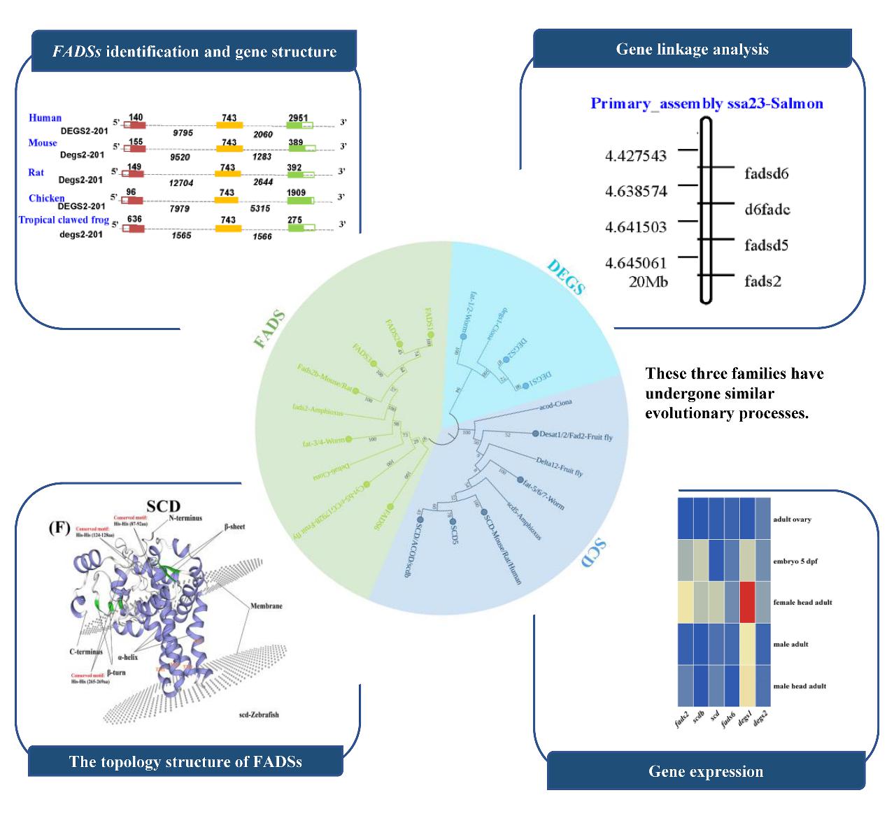 脂肪酸去饱和酶(FADSs)超家族包含脂肪酸去饱和酶(FADS)、硬脂酰-CoA去饱和酶(SCD)和鞘脂∆4-去饱和酶(DEGS)三个家族成员。该超家族成员的类型、结构和功能与不饱和脂肪酸(UFAs)的合成能力密切相关。目前,鱼类中FADSs的研究多集中在海水鱼类,淡水经济鱼类基因组中FADSs超家族基因/蛋白的系统演化分析亟需完善。因此,本团队采用系统生物学的方法对FADSs超家族成员的种类、数量、基因/蛋白结构、染色体位置、基因连锁图谱、选择压力、系统发育和组织表达等进行了系统的挖掘和分析。研究发现,27个代表物种基因组中存在156个FADSs基因。其中,FADS1和SCD5在大多数鱼类中都丢失;与哺乳动物不同,鱼类多具有非典型的FADSs基因结构,但是,所有FADSs蛋白均含有三个保守的组氨酸基序;同一家族中的基因多连锁存在于同一染色体上,不同家族中,FADS常和SCD或DEGS位于同一染色体上;与之类似,在系统进化树中,FADS/SCD/DEGS三个家族成员分别位于三个不同的分支。综合基因结构、蛋白保守基序、基因连锁及系统演化结果,我们推测FADSs超家族可能是由同一祖先基因通过基因复制及功能演化而来。该研究明晰了淡水经济鱼类中FADSs超家族的种类、结构及系统演化关系,可为FADSs的功能机制分析及富含PUFA功能性淡水水产品的开发提供新的研究视角。