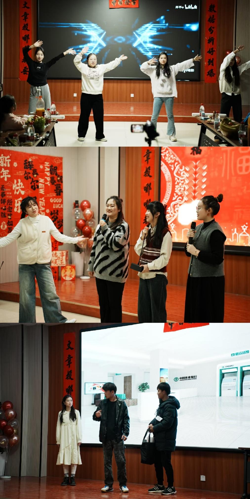今年晚会亮点纷呈,一曲合唱《最炫民族风》,带领我们感受民族文化的魅力,点燃现场火热的氛围;晚会首个游戏环节“蒙眼弹瓶盖”带给大家无尽欢笑;由朱换换、张育杰、杨纯纯、王贝贝带来的《三句半》以其幽默的语言和独特的节奏营造了轻快诙谐的氛围;随后,歌曲《骄傲》像是一封写满了对家人深情厚意的音乐家书,那舒缓且动人的旋律,如同冬日里的暖阳,一点点洒在我们的心间,驱散了寒冷,只留下满满的温暖。