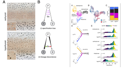 田雪老师对文献Thyroid hormone regulates distinct paths to maturation in pigment cell lineages进行了讲解,主要是通过10×单细胞测序和基因编辑,研究斑马鱼内甲状腺激素(TH)与色素细胞之间的关系。