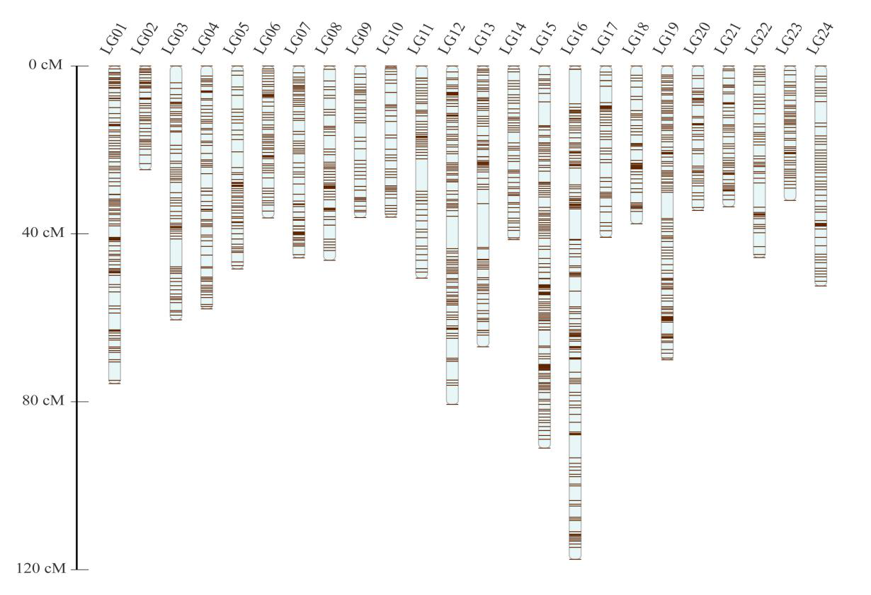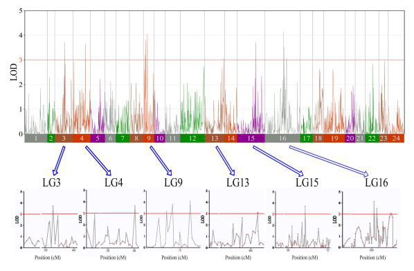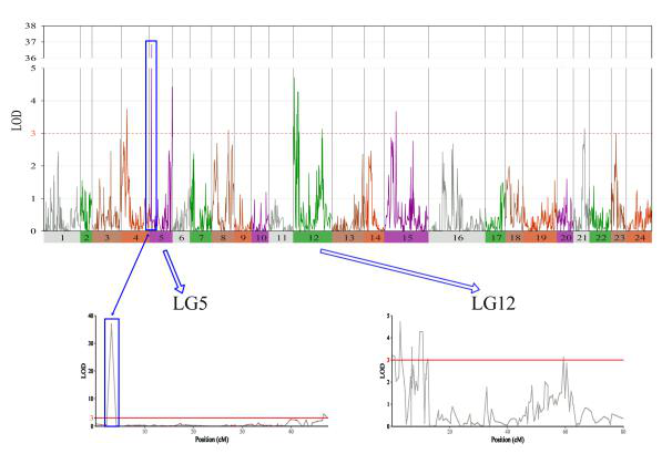 团队通过对来自于同一个父母本的150个后代,进行RAD-seq技术分析。筛选得到分布在24个连锁群上的6917个SNP位点。构建得到的遗传连锁图谱的总遗传长度为1,261.96 cM,每个连锁群平均为52.58 cM。研究发现,在LG04,LG05,LG08,LG12,LG15,LG21和LG23上分布有13个显著的QTLs与性别决定相关。在LG05上发现可解释变异率为71.48%的一个显著性QTL,该QTL由SNP410100和SNP768973两个位点支持,SNP410100分型结果为AG/AA,SNP768973分型结果为CT/TT,且雌雄分型比例均约为1:1。另外,发现32个QTLs分别与体重、体长、体高和头长等生长性状相关。研究成果为大口黑鲈重要经济性状的定位,基因组的组装以及大口黑鲈的选择培育和新品种的分子育种奠定了遗传学基础。