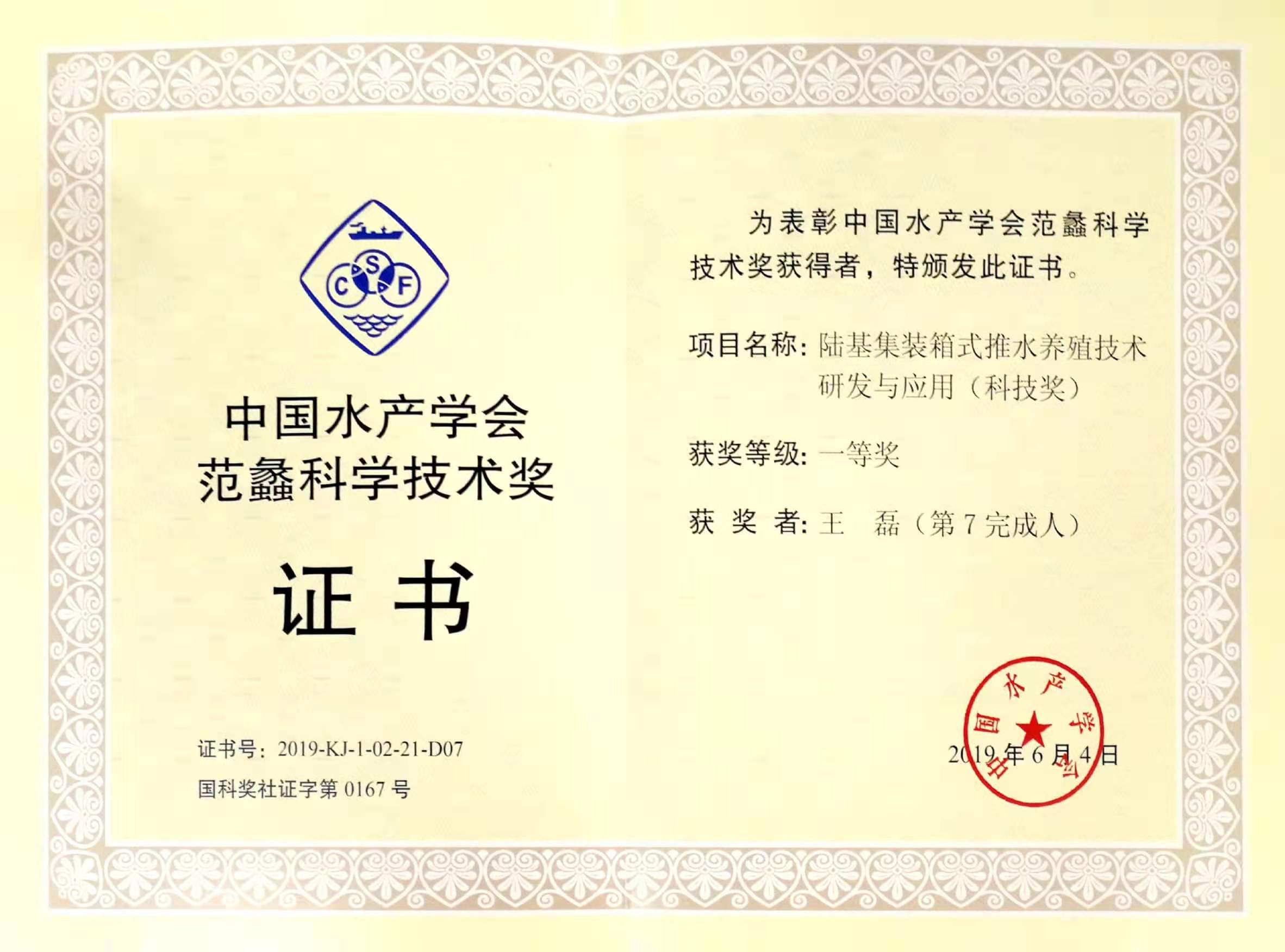 在颁奖环节,我团队王磊老师获得中国水产学会范蠡科学技术奖一等奖,位列第七完成人,获奖项目为:陆基集装箱式推水养殖技术研发与应用。