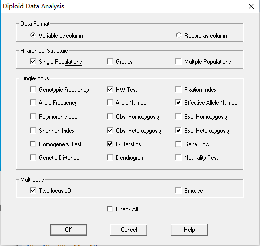 选“Co-Dominant-Diploid data”弹出对话框中根据所需进行勾选,常用的如下: