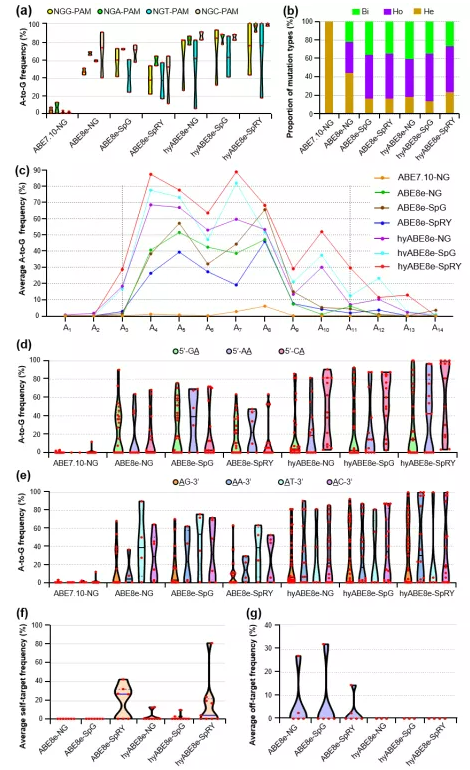 普通ABE8es与PhieABEs在NGN-PAM靶点中的PAM偏好性(a)、突变类型(b)、编辑活性窗口(c)、A碱基5’与3’端碱基的位点偏好性分析(d和e)、T-DNA自靶向(f)与sgRNA依赖的脱靶效应(g)比较。