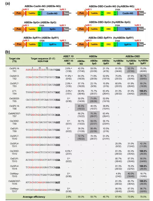 目前广泛使用的ABE7.10系统在植物细胞中的编辑效率普遍很低【2】,而最近基于新型腺嘌呤脱氨酶TadA8e开发的ABE8e系统在一定程度上提高了植物单碱基编辑效率【3, 4】,但仍缺乏在多个代表性靶点中对其稳定性和靶序列偏好性进行系统分析。来自人源Rad51蛋白非序列特异性的ssDNA结合结构域(DBD),对解旋后的DNA单链具有稳定作用【5】,但其与ABE系统的兼容性如何,以及能否提高碱基编辑系统的活性并扩增编辑窗口,均是未知的。此外,目前大多数碱基编辑系统使用融合识别NGG-PAM的SpCas9n变体,其基因组靶点的选择自由度受到很大的限制【3】。