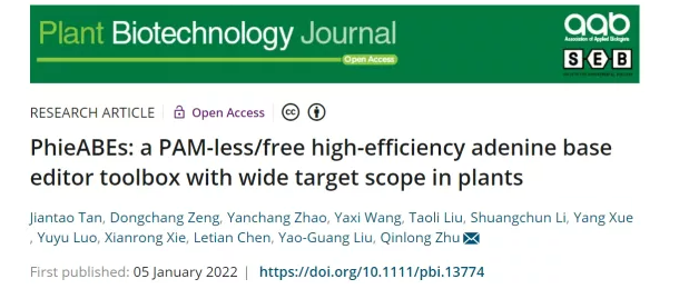 近日,华南农业大学生命科学学院、亚热带农业生物资源保护与利用国家重点实验室和岭南现代农业科学与技术广东省实验室刘耀光院士/祝钦泷研究员团队在Plant Biotechnology Journal在线发表了题为PhieABEs: a PAM-less/free high-efficiency adenine base editor toolbox with wide target scope in plants的研究论文,利用高活性腺嘌呤脱氨酶、单链DNA结合结构域(DBD)与广靶向的SpCas9变体,成功开发出一套几乎无PAM限制的高效广靶向植物腺嘌呤碱基编辑器PhieABEs(Plant high-efficiency ABEs)。