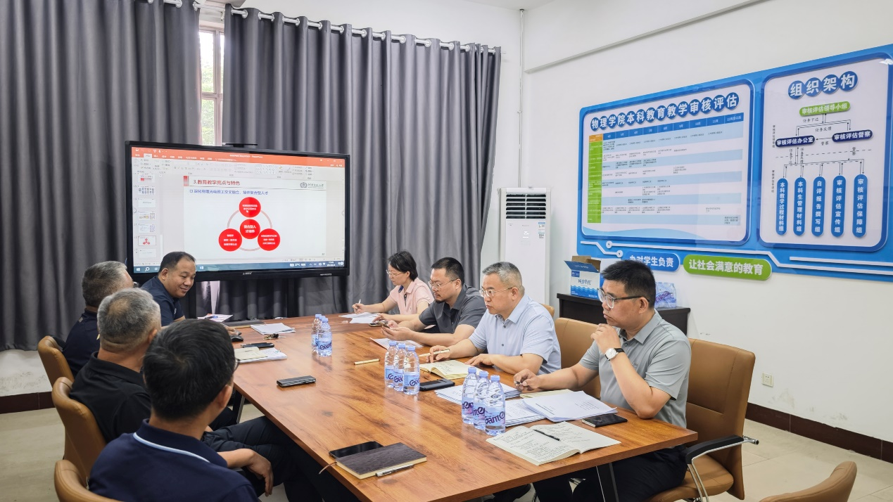 为确保本科教育教学审核评估各项工作高质量推进,结合第二阶段学校审核评估工作的具体要求,6月4日,校党委常委、副校长、校审核评估办公室组长聂国兴带领审核评估办公室部分工作人员,分别到数学与信息科学学院、物理学院、生命科学学院、外国语学院督导检查审核评估工作。学院审核评估工作领导小组和相关工作人员参加了督导检查汇报会。