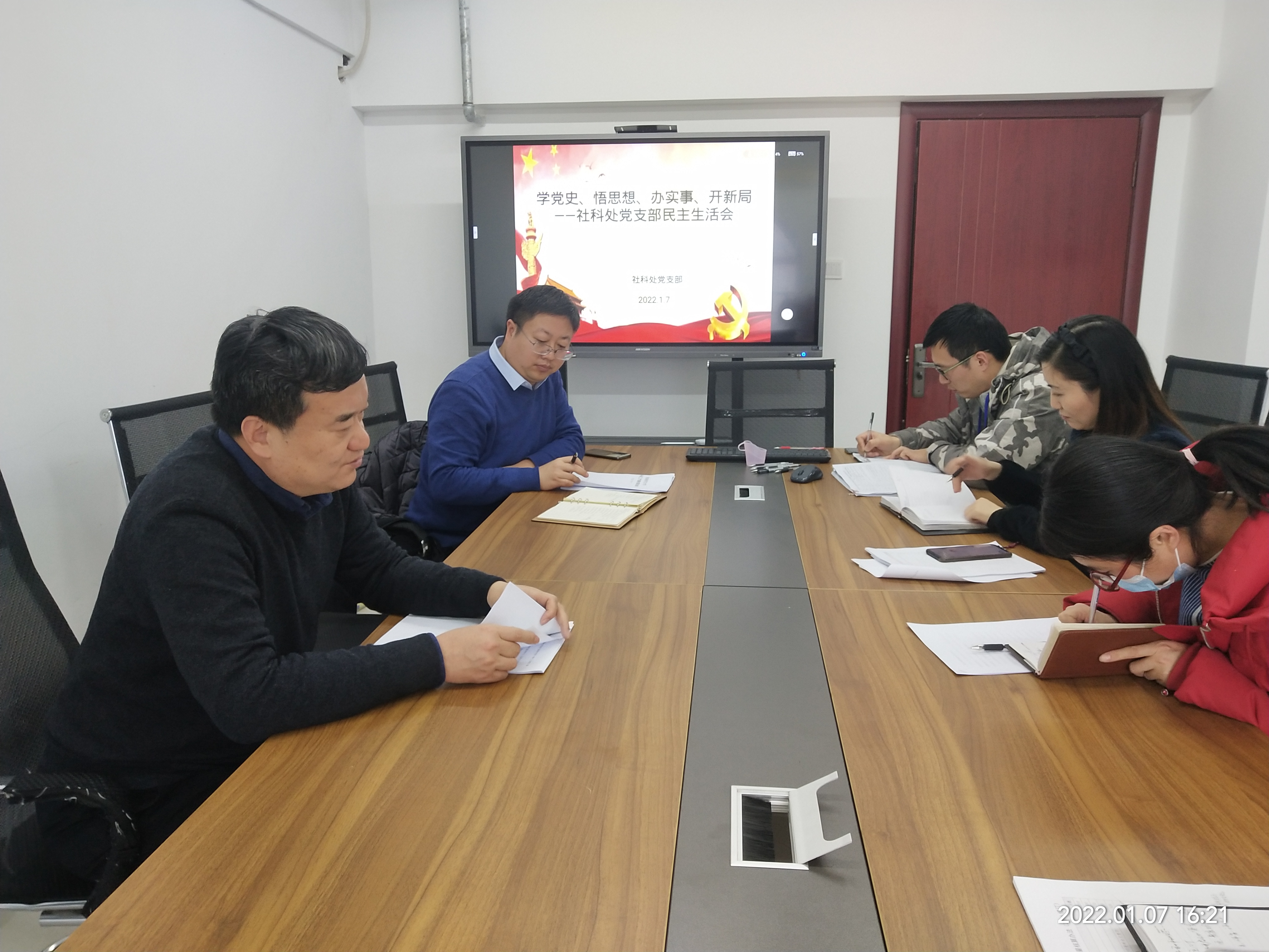2022年1月7日下午,社科处党支部在致远楼509室召开党史学习教育专题民主生活会。社科处党支部书记李永贤主持会议。 会议开始后,李永贤代表社科处处级领导班子报告了党史学习教育开展情况和领导班子对照检查问题情况,深刻剖析了问题产生的根源,并提出了下一步整改措施。他谈到,通过认真学习习近平新时代中国特色社会主义思想、党的十九届六中全会和总结大会精神、全国脱贫攻坚总结表彰大会等重要讲话精神,社科处领导班子深刻领悟“两个确立”的决定性意义,牢记党是什么、要干什么这个根本问题,树立了正确的党史观,增强“四个意识”、坚定“四个自信”、做到“两个维护”,履职尽责,不断推动我校社科工作迈上新台阶。针对存在问题,提出了下一步的整改方向。 随后班子成员分别做个人对照检查,并相互开展了严肃认真的批评和自我批评,达到了打扫灰尘、净化灵魂、统一意志、增进团结的目的。