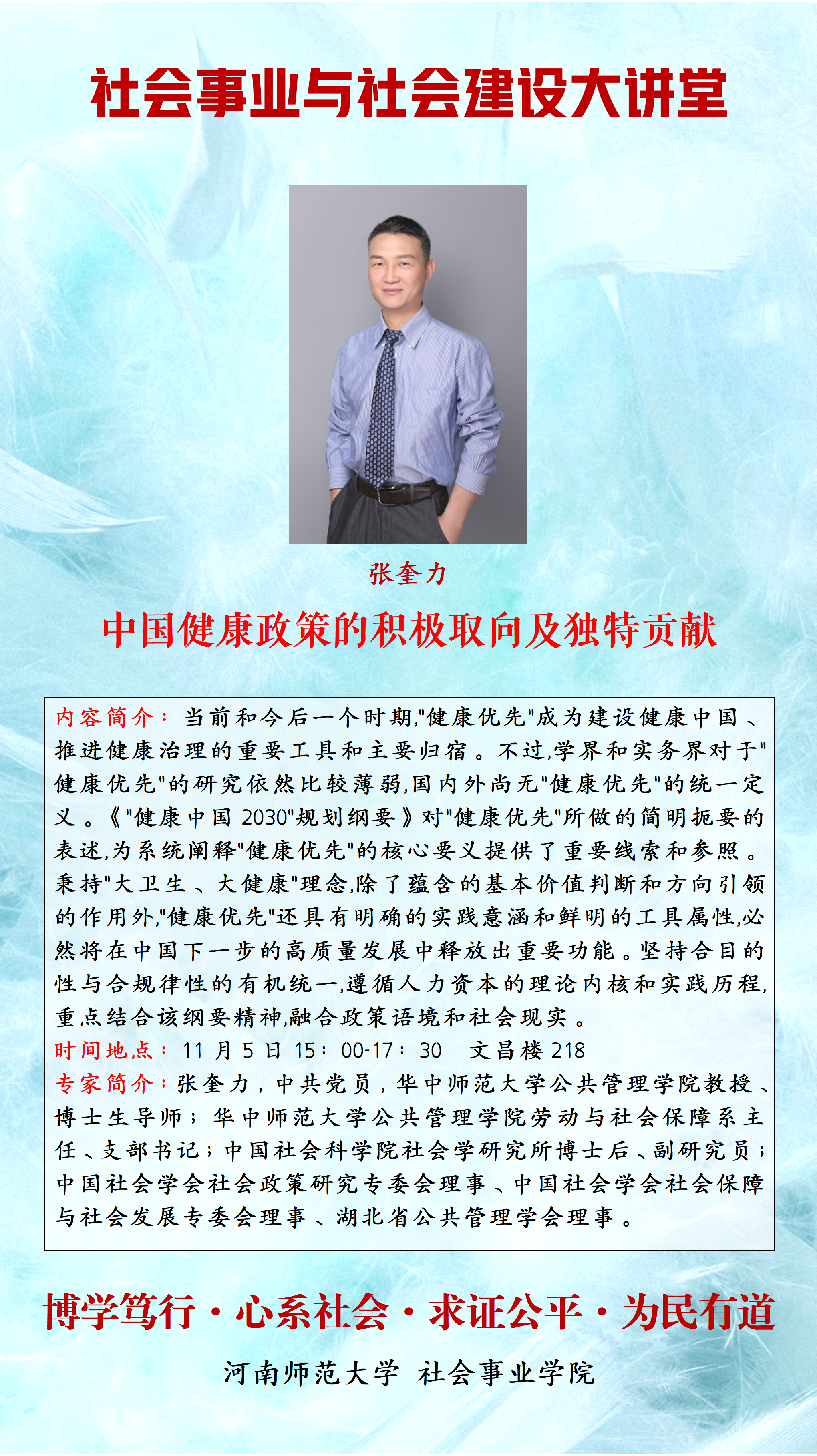 讲座:11月5日 中国健康政策的积极取向及独特贡献