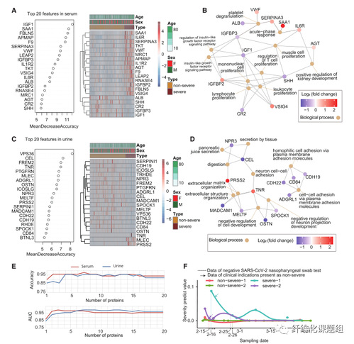 为了探究尿蛋白是否可以用于机器学习建模,以实现对新冠肺炎严重程度的分类。根据平均准确度下降排序,分别选择了血清和尿液蛋白数据中排名前20的蛋白质,并分别对这些蛋白进行富集分析。随后又进一步探索了尿液蛋白与血清蛋白区分新冠严重程度的能力,通过对随机森林模型的不断优化,并在内部交叉验证后评估各自分类器的精度,结果表明,尿液蛋白所构建的模型在分类能力与血清蛋白模型基本一致,且两种分类器的AUC值都高于0.95。此外,又在13名新冠患者的独立尿蛋白组数据集中进一步评估尿蛋白的分类能力,这些患者的尿样是在不同时间点采集的,对于严重的新冠肺炎患者,在入院后的较晚时间点样本的眼中成都预测值呈下降趋势,表明尿蛋白模型可以用于早期临床严重程度的分类。