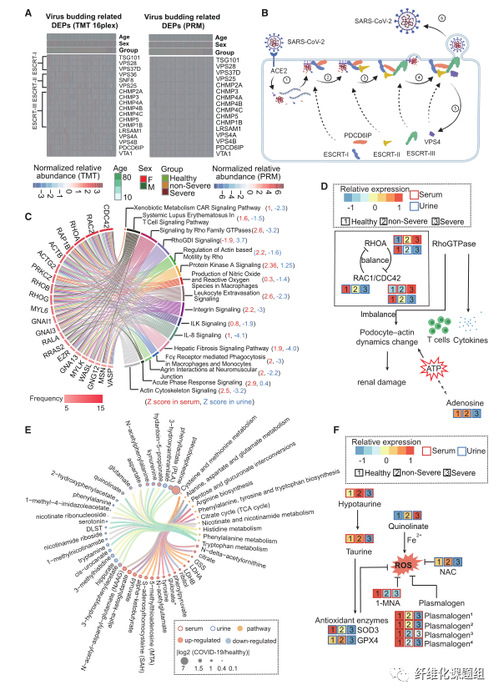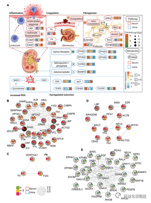 该研究统计了血清和尿液中异常的通路,发现最主要的失调通路有20条是二者共同存在的。其中来自Rho GTP酶家族的CDC42、RAC1/RAC2和RHOA是尿液和血清中最主要的失调蛋白,这些蛋白的失调可能会导致肾小球硬化和肾脏损伤。同时,代谢组学数据也表明,ATP代谢产物腺苷在重症患者的尿液中显著减少,表明患者体内可能存在足细胞运动障碍、免疫系统功能障碍和肾脏损伤。