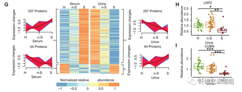 研究还发现在尿蛋白和血清蛋白中有301种蛋白的表达模式相反,推测产生这种情况的原因可能是由于尿液在形成前,血液蛋白被肾小球过滤并被肾小管重新吸收,参与这一过程的两个重要调节因子megalin(LRP2)和cubilin(CUBN)在尿液中均下调,因此推测新冠肺炎患者的肾小管重吸收过程出现紊乱,导致某些尿蛋白下调。文中也提到这种表达模式的差异可能存在于其他疾病中,还有待进一步证实。