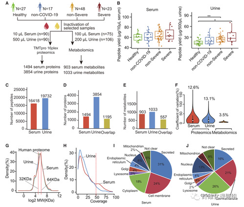 该研究共纳入71例新冠肺炎患者,包括23例重症患者、48例非重症患者。另有17例患有咳嗽、发热等流感样症状的非新冠肺炎患者和27例健康对照作为对照组。对新冠肺炎患者及对照组的血清和尿液样本进行蛋白质组学分析,发现在重症和非重症患者的尿液中,多肽产量显著高于健康对照组,同时在尿液样本中检测到的蛋白质数量是血清中的2.5倍,且血清中80%的蛋白质也可以在尿液中被检测到。此外,该研究也采集了患者组与对照组个体的尿液样本和血清样本进行代谢组学分析,与蛋白质组不同的是,只有62%的血清代谢物可以在尿液中检测到。这种蛋白质和代谢物的差异可能是由于它们在血清和尿液中的丰度及稳定性不同所致