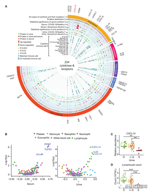 从血清和尿液样本的代谢物中共定量出234中细胞因子和受体,其中87种细胞因子在血清和尿液中都存在,并将其分为6大类,包括趋化因子、干扰素、白介素、TGF-β家族、TNF家族以及其他细胞因子。随后计算了血清和尿液中细胞因子与免疫细胞的相关系数。发现CXCL14仅能在尿液中检测到,在严重病例中表达下调,且与淋巴细胞计数显著相关。由于淋巴细胞减少是严重新冠肺炎的特征,因此推测尿液中CXCL14可能是新冠肺炎严重程度的生物标志物。