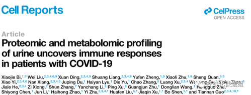 2022年1月18日,西湖大学Tiannan Guo等人在Cell Reports上发表了一篇题为Proteomic and metabolomic profiling of urine uncovers immune responses in patients with COVID-19的文章。本研究对新冠肺炎患者和健康对照组的尿液和血清样本进行了蛋白质组与代谢组学分析,发现尿液蛋白可以实现对新冠肺炎患者严重程度的分类,同时发现重症新冠肺炎患者尿液中细胞因子CXCL14表达下调与外周血淋巴细胞计数显著相关,或可成为新冠肺炎严重程度预测的生物标志物。综合多组学分析结果表明,新冠肺炎患者的先天性免疫激活和炎症反应可能会导致潜在的肾脏损伤。这项研究证明了在多组学分析中包括尿蛋白质组在内评估新冠肺炎以及其他感染性疾病的免疫病理生物学和临床病程方面的意义。