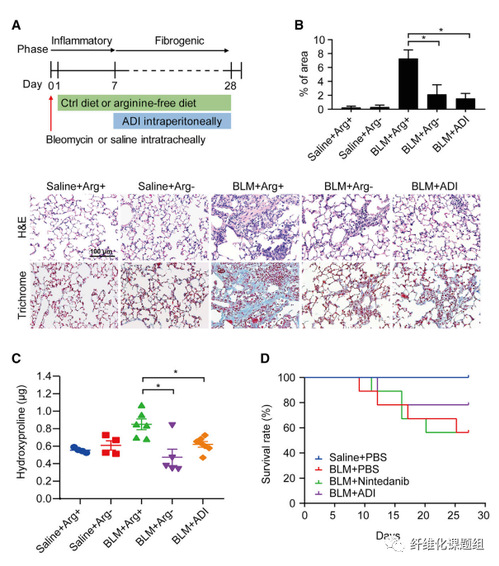 为了将实验从体外转移到体内,作者建立了BLM诱导的肺纤维化模型,在气管内灌注博来霉素后,对小鼠进行无精氨酸饮食或者腹腔注射ADI。并将实验分为五组,经过BLM处理之后,肺组织的结构发生了广泛的变化,并且来自无精氨酸饮食以及ADI处理的BLM小鼠的纤维化病变显著降低。BLM诱导的羟脯氨酸水平的上调在BLM+无精氨酸饮食和BLM+ADI组中显著下调。为了比较ADI和尼达尼布的抗纤维化作用,作者进行了另外一组BLM所诱导的肺纤维化研究,发现只有ADI处理后的小鼠在BLM诱导后表现出更高的生存率。