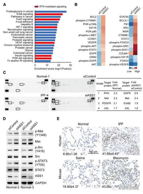 为了进一步分析ASS1调控的信号网络,将对照和ASS1敲除细胞都进行了RPPAs分析。由于RTKs信号通路在成纤维细胞活化以及纤维化发展进程中发挥着重要的作用,所以作者就筛选出由RTKs所介导的信号通路,并且对ASS1敲除的正常成纤维细胞以及ASS1缺陷的IPF成纤维细胞进行蛋白以及磷酸化蛋白的表达蛋白差异热图,并得出四种排名靠前的酪氨酸磷酸化上调的RTKs。接下来作者对对照组以及ASS1敲除的正常肺成纤维细胞的细胞裂解物进行免疫印迹,发现P-Met及其下游蛋白P-Src和P-STAT3的表达水平都上调了。通过IHC染色,作者证明了在IPF患者以及BLM诱导的小鼠模型的纤维化肺组织中都有较高水平的P-Met表达信号。