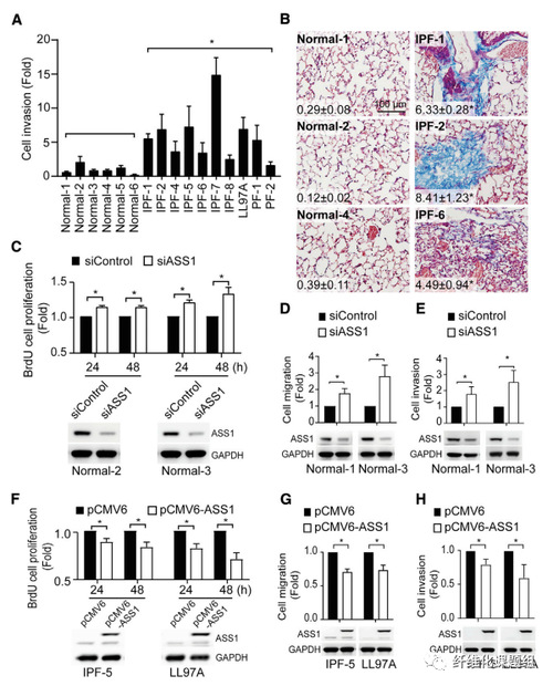 由于严重的纤维化是由活化的成纤维细胞表型进行传播的,例如细胞侵袭和迁移,所以作者首先比较了正常和IPF的原代成纤维细胞的侵袭能力。与正常对照组相比,所有的IPF成纤维细胞的细胞侵袭能力都显著提高。作者通过将原代人肺成纤维细胞转移到严重联合免疫缺陷小鼠中建立了一种肺纤维化模型,发现植入IPF成纤维细胞的肺组织发生了纤维化病变以及细胞外基质沉积的现象。同时,作者发现在原代正常肺成纤维细胞中沉默ASS1的表达可以增加细胞的增殖、迁移和侵袭能力;相反,将p-CMV6-ASS1构建载体转移到ASS1缺陷的IPF成纤维细胞中,细胞的增殖、迁移和侵袭能力下降。