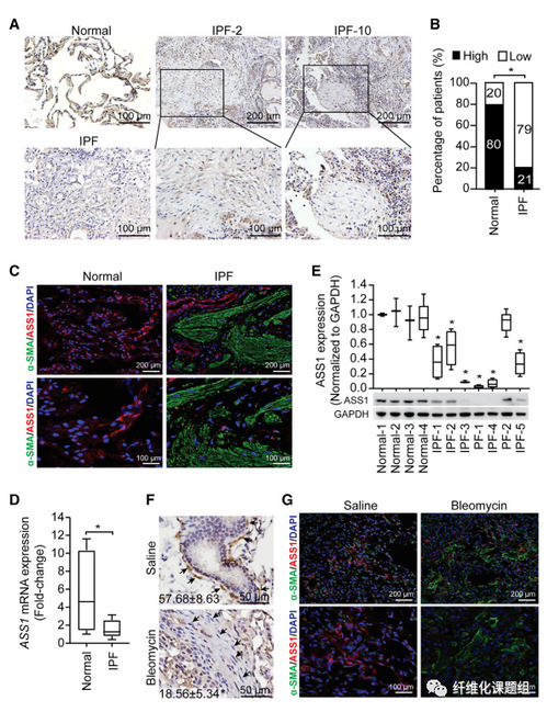 最近研究证明,代谢产物的改变以及代谢途径的失调可能会导致多种呼吸系统的疾病,包括肺纤维化。为了证明正常细胞和特发性肺纤维化细胞的代谢途径发生了改变,作者将来自健康供体和肺纤维化患者体内的原代成纤维细胞进行了代谢研究。ASS1,是精氨酸生物合成过程中的关键酶,并且对于维持细胞内的精氨酸水平非常重要。作者使用ASS1抗体对正常组织以及IPF患者标本进行免疫组化染色,发现在IPF患者的组织切片中ASS1信号表达下调,并且在α-SMA阳性的纤维化病灶的肺组织中观察到了较弱的ASS1信号。与正常肺成纤维细胞相比,无论是mRNA还是蛋白水平,IPF患者的原代成纤维细胞中ASS1的表达都是明显下降的。并且在博来霉素诱导的小鼠模型中也得到了相同的实验结果。