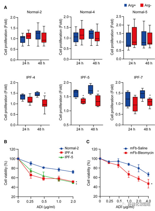 由于缺乏ASS1的细胞不能自主合成精氨酸,所以为了生存需要从外界摄取精氨酸。精氨酸脱亚氨酶(ADI)或聚乙二醇化的ADI可以阻断细胞从外界环境中摄取精氨酸,于是作者就在含精氨酸以及不含精氨酸的条件下培养成纤维细胞,培养3天后,测量细胞的增殖速率。经过数据分析,正常成纤维细胞在24小时和48小时的增殖无显著变化,而在无精氨酸培养条件下,IPF成纤维细胞的增殖是显著下降的。作者接下来用ADI处理细胞,发现ADI可以显著损害细胞的活力,并且在IPF的成纤维细胞中更为明显。作者继续用ADI处理BLM诱导的小鼠模型,通过细胞活力分析证明,ADI对BLM诱导的小鼠模型作用效果非常显著。