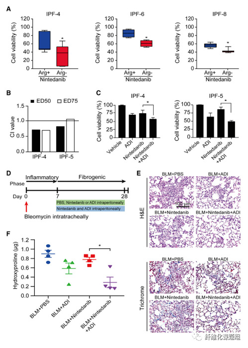 由于在肺纤维化中,ASS1的缺失激活了Met受体,但是Met受体并不是尼达尼布的治疗靶点。为此,作者将IPF成纤维细胞在含或不含精氨酸的培养基中用尼达尼布处理72h,发现与含精氨酸的细胞相比,用尼达尼布处理的肺成纤维细胞在不含精氨酸的培养基中细胞活力显著降低。用尼达尼布和ADI协同处理IPF肺成纤维细胞发现细胞活力降低,并且羟脯氨酸水平也降低。接下来,作者又进一步验证了尼达尼布和精氨酸剥夺的协同作用,通过肺切片的组织学分析显示,在尼达尼布和ADI联合治疗的小鼠中,BLM诱导的肺成纤维细胞损害显著降低;与组织学分析一致,联合治疗的小鼠肺部羟脯氨酸水平降低。