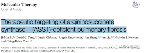 2021年4月4日发表在Molecular Therapy上的题为Therapeutic targeting of argininosuccinate synthase 1 (ASS1)-deficient pulmonary fibrosis的文章。报道了精氨酸琥珀酸合成酶1(ASS1)的缺失在肺纤维化病理过程中的治疗靶点作用。此研究发现在纤维化过程中,ASS1是显著降低的,与肺纤维化状态呈负相关。作者还发现ASS1敲除的成纤维细胞中,Met受体活化并且作用于Src-STAT3信号的上游。在无精氨酸培养条件下以及在精氨酸脱亚氨酶(ADI)的作用下,可以杀死纤维化的成纤维细胞,减轻博来霉素所诱导的小鼠肺纤维化,并且可以增加尼达尼布的治疗效果,成为纤维化的一个新的治疗靶点。