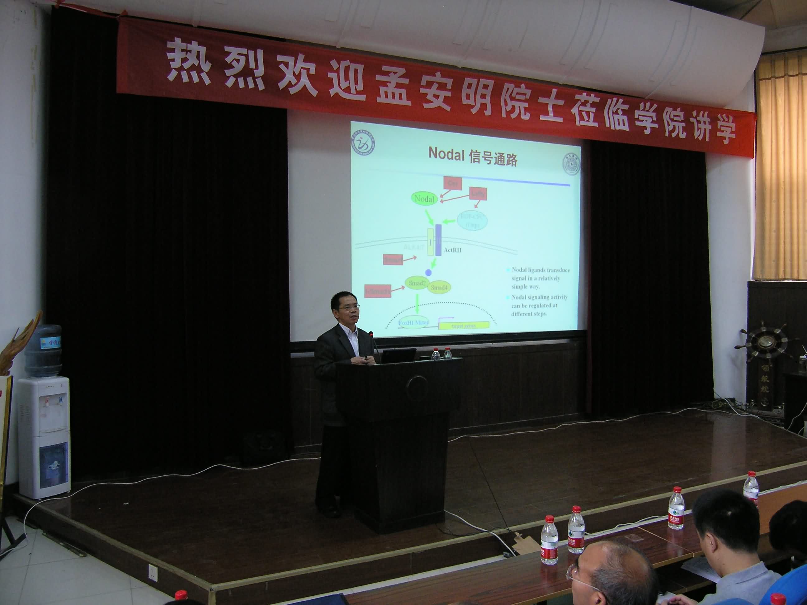 5月9日上午,中国科学院动物研究所所长、中国动物学会理事长孟安明院士应生命科学学院邀请,在学院报告厅给全院师生带来一场题为“动物胚胎的早期发育:胚层诱导和图示形成”的精彩学术报告。莅临我院访问的重庆大学生物工程院副院长王贵学教授一行四人及我校副校长徐存拴、教务处处长陈广文、副院长聂国兴、校特聘教授李效宇、相关学科教师、研究生、本科生约200人聆听了报告会。报告会由卢龙斗院长主持。