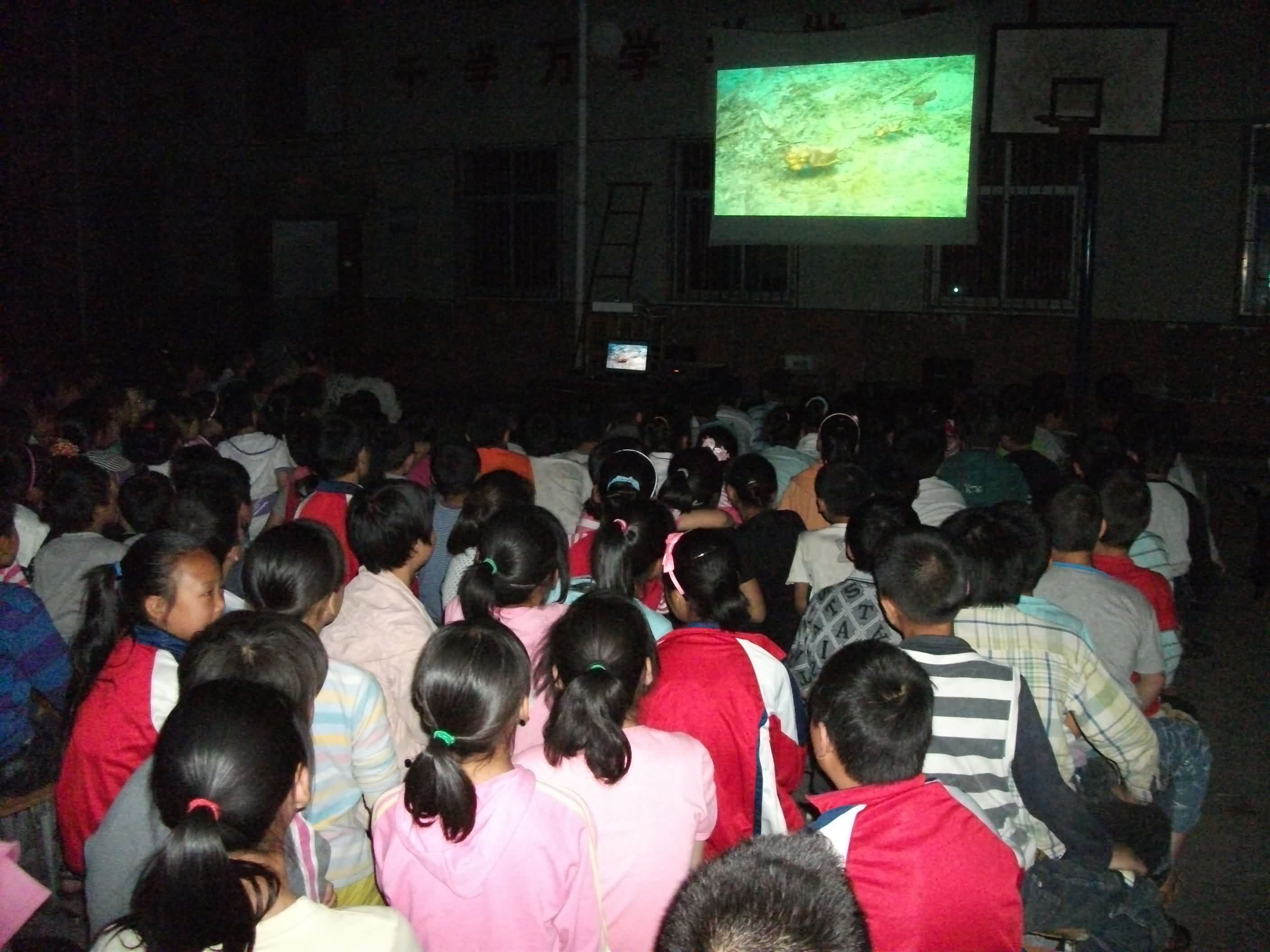 拍石头小学是我院长期帮扶对象,这一次我们首先跟重点帮扶的四名特困生——张筱、赵培文、郭合军、霍万乐进行了座谈,了解了他们近期的学习生活情况,并再次资助了他们一学期的住校生活费。晚上7:30到9:30,在学校操场,我们还利用院里的一套多媒体设备为孩子们带来了一场科普电影展演,内容包括河南师大及生科院简介、高清纪录片《海底世界》、高清科普片《行星地球》。全校300余名师生全程观看了影片,大家都被片中精彩的镜头深深吸引。