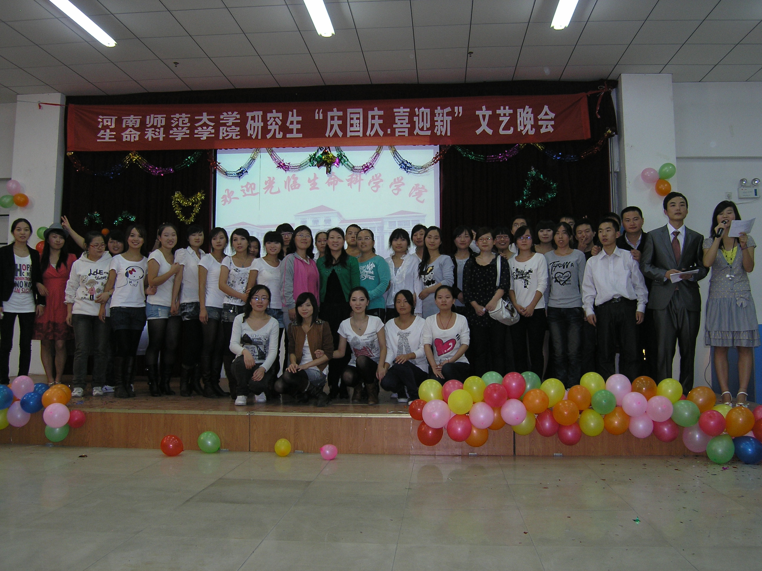 9月29日晚19:30分生科院研究生以“庆国庆-喜迎新”为主题的文艺晚会在生物西楼七楼活动室隆重举行,莅临本次晚会的有常重杰副院长、靳同霞老师、马剑敏老师、周延清老师、刘海英老师、崔长海老师、南平老师等十多位领导和老师,本次晚会吸引了众多11级研究生参与到节目中,全体生科院研究生和部分兄弟学院研究生观看了本场晚会,晚会由生命科学学院研究生分会主办。