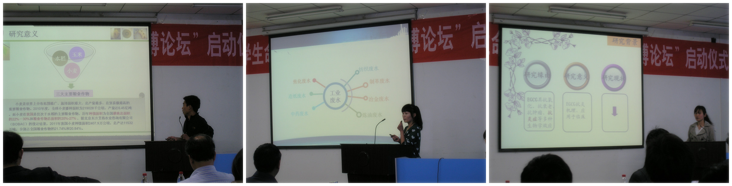 本次论坛开幕式由生科院研究生辅导员靳同霞老师主持,生科院研究生秘书邵云老师宣读了本次"学术活动月"的实施方案。特邀陈晓虹教授、姬生栋教授、李学军教授、杨洪教授、张建新教授担任评委。开幕式上,我院研会主席马军国代表全体研究生发言;导师代表李学军教授用简短的语言表达了对研究生们的期望。本次学术活动月从四月五日到四月二十日,由部分研究生提供一个在专业领域、学术精神等方面之间的一个交流。来自生命科学学院的3名博士生,60名硕士生参加了此次硕博论坛。