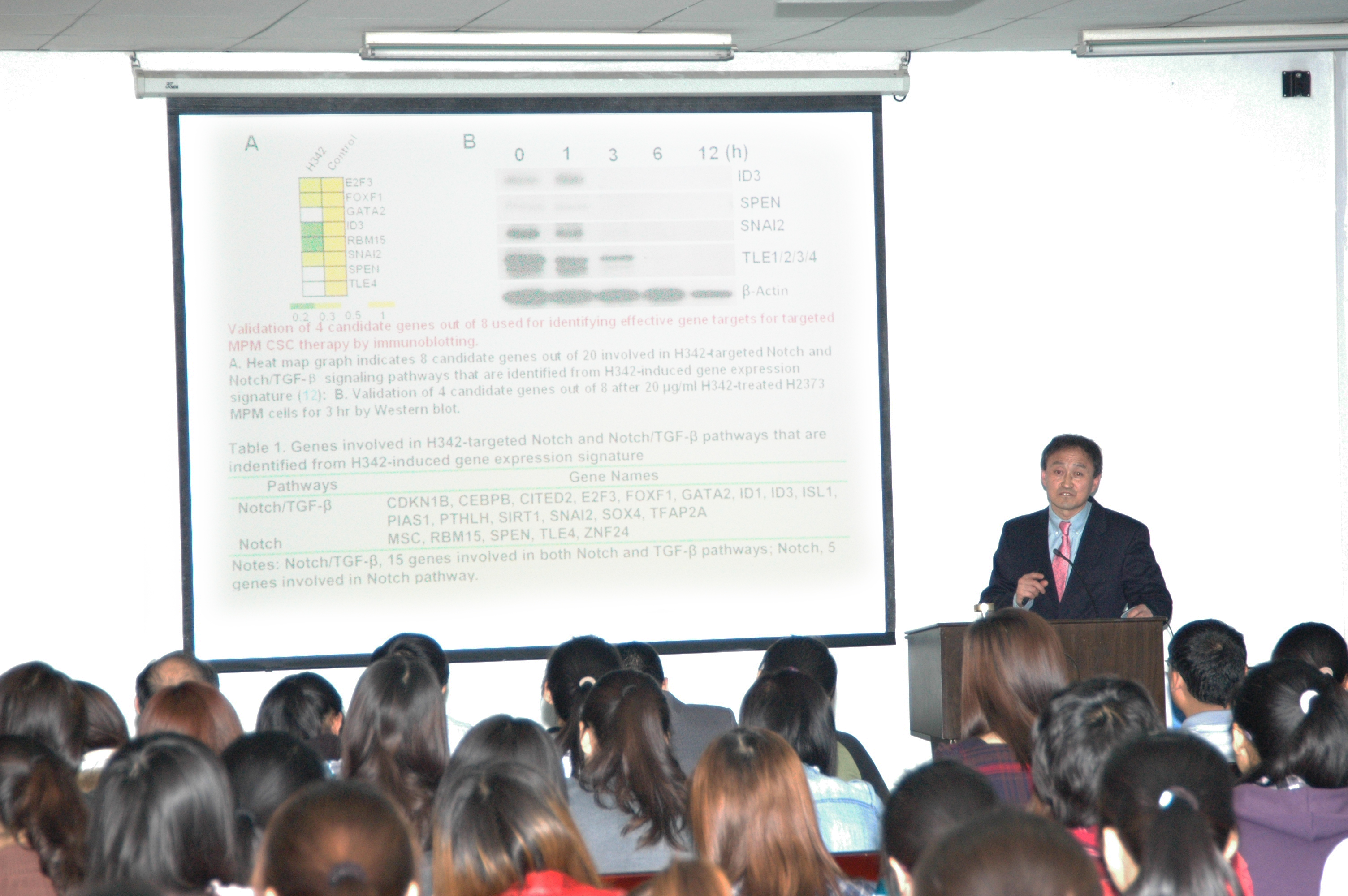 报告中,张教授首先以肿瘤干细胞的重要诱导剂“hoechst_33342”为切入点,对其工作原理、使用方法及诱导凋亡机制中出现的问题等内容作了具体阐述。接着,张教授就“肿瘤干细胞的特性”、“肿瘤干细胞的耐药机制”、“肿瘤分化疗法”等几个方面的研究内容做综述分析,并为大家展示了肿瘤干细胞靶向治疗的最新研究成果。王教授深入浅出的讲解,生动翔实的例证,开阔了学生的眼界,启迪了学生的思维。在讲到“hoechst_33342诱导染色”时,张教授强调,试验中小孔数目确定就是一项艰巨的任务,每一个小孔就可能花费一个小时,而每一个小环里就有数千个小孔。他也借此勉励在场的老师和学生,从事科学研究要有有耐心、有恒心。最后,张教授在互动环节与在场师生进行交流沟通,他耐心细致的讲解,使在场师生受益匪浅。