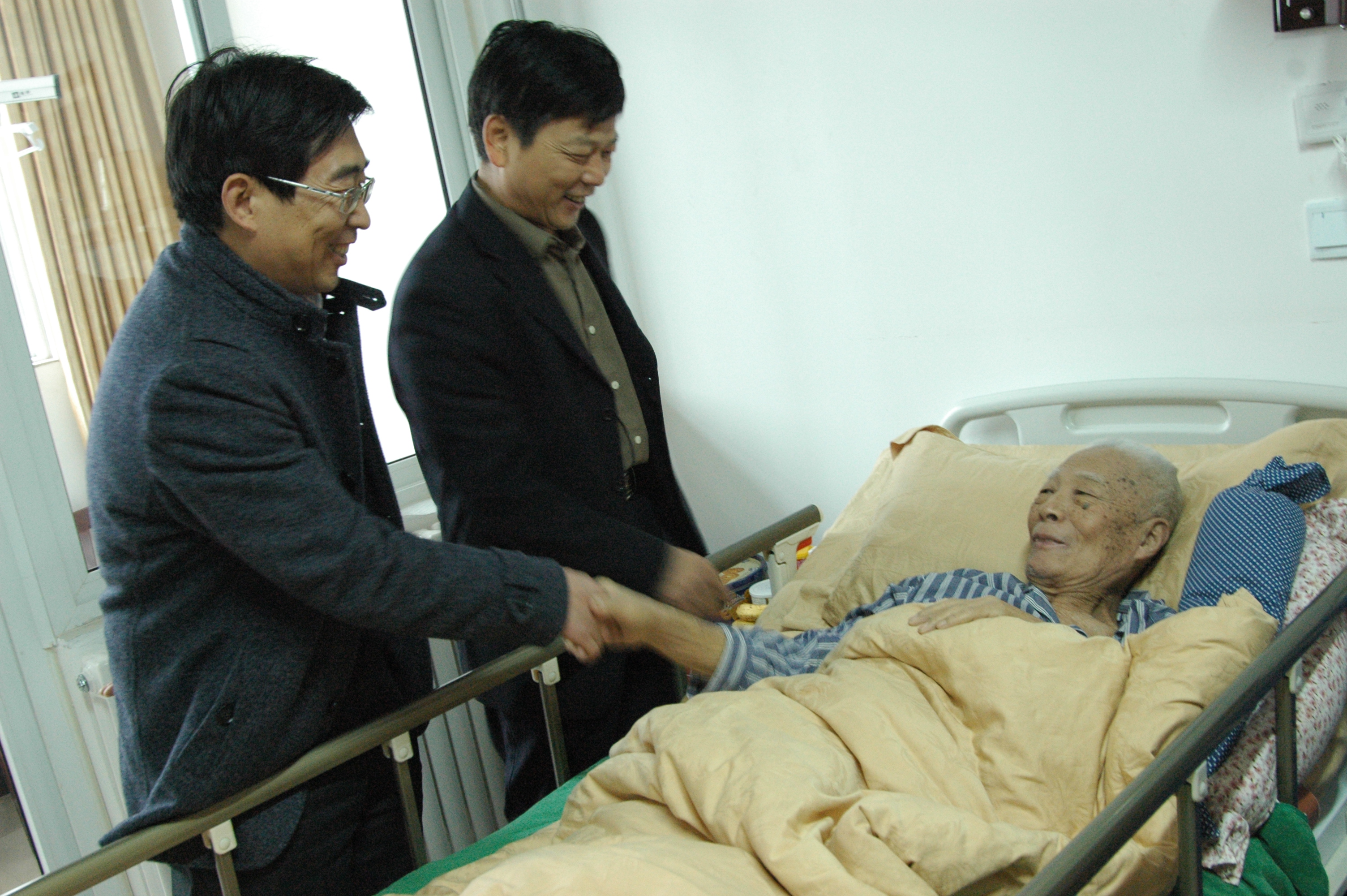 段书记一行慰问了正在住院疗养的85岁高龄的和振武老师,送上了果篮和亲切的问候,详细询问了和老师的身体和生活状况,听取了疗养院对和老师情况的介绍,同时,感谢和老师为学院事业所做出的贡献,对他退休后仍然关注学院的发展和成长表示深深的敬意,祝愿他尽快康复,幸福生活。和老师仔细了解了学院的现状,并紧紧握住领导们的手,对学院的关心表示感谢,希望能早日康复再到学院去看看。