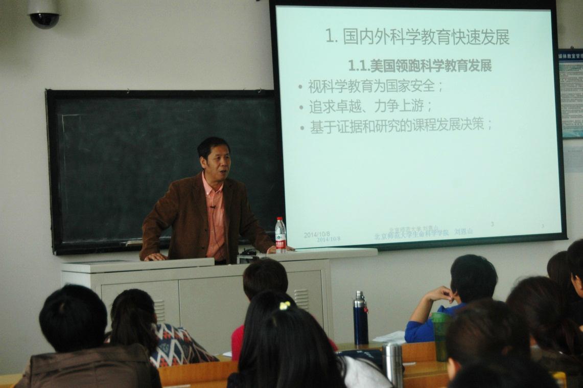 2014年10月8日,国家基础教育课程教材专家工作委员会委员,全国教师教育课程资源专家委员会会员,《生物学通报》编委会常务副主编,全国中学生物学竞赛委员会主任,北京师范大学博士生导师刘恩山教授应邀在伟德官网下载苹果版新联学院小店校区综合楼A307房间做了一场主题为“从科学教育发展看生物学课堂教学改革”的学术报告,“国培计划”-初中生物脱产置换班培训学员、生命科学学院相关专业老师和研究生100多人聆听了此次报告。报告会由生命科学学副院长李建军主持。