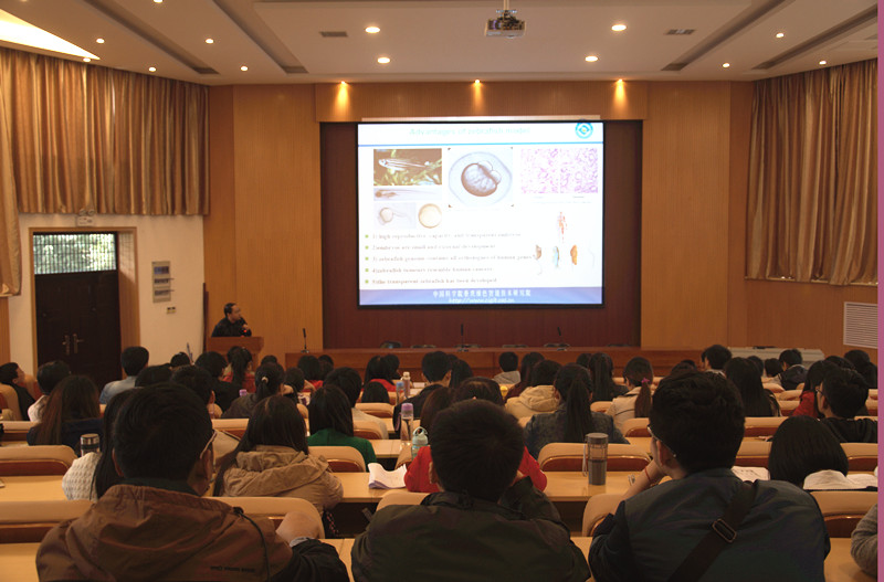 报告会中,裴得胜研究员针对“斑马鱼模型的优势、斑马鱼模型在环境毒理中运用、斑马鱼致瘤风险评估、斑马鱼中个性化微量毒物、斑马鱼新方向之监测水环境”四个方面作了详细讲解。裴得胜研究员利用图文结合及模型建立的形式将斑马鱼在监测水环境的应用进行逐步分析,使在场师生清晰明了掌握相关知识。在斑马鱼研究新方向中,他明确指出四个新研发方向,即“提高透明斑马鱼灵敏度、制定实时监测新元素、采用透明斑马鱼的高通量监测、利用基因修饰检测微量斑马鱼”。裴德胜研究员严谨求实的科研态度、积极探索的求知精神使在座的师生们受益匪浅。