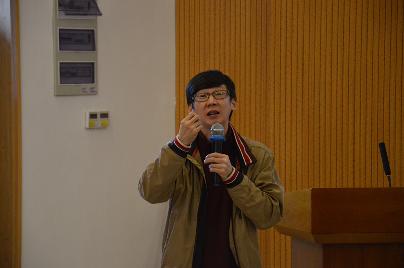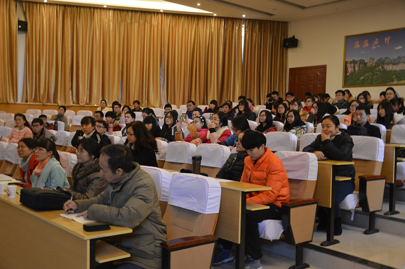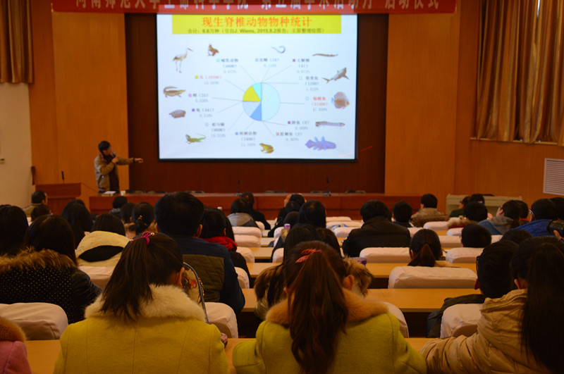 报告会伊始,王原研究员以掀起古生物热潮的大片《侏罗纪公园》为切题引出报告会内容。并结合自己的研究方向以时间轴为主线介绍了脊椎动物“从鱼到人”五亿多年的演化历史。他着重讲述了“从鱼到人”演化过程中的九个关键转折点,即“脊梁骨的起源、颌的出现、由水登陆、羊膜卵的出现、重返海洋、哺乳动物的兴起、飞上蓝天、羽毛的演化、人类的黎明”,使在场师生明确了解生物演化历程。王研究员语言生动幽默,以“先有鸡还是先有蛋”一问题引出关键转折点之羊膜卵的出现。他指出,恐龙蛋是保存下来最早的羊膜卵,羊膜卵的出现促使脊椎动物真正适应陆地环境。最后,王研究员与在场师生进行现场互动,他严谨求实的科研态度、积极探索的求知精神使在座的师生们受益匪浅。