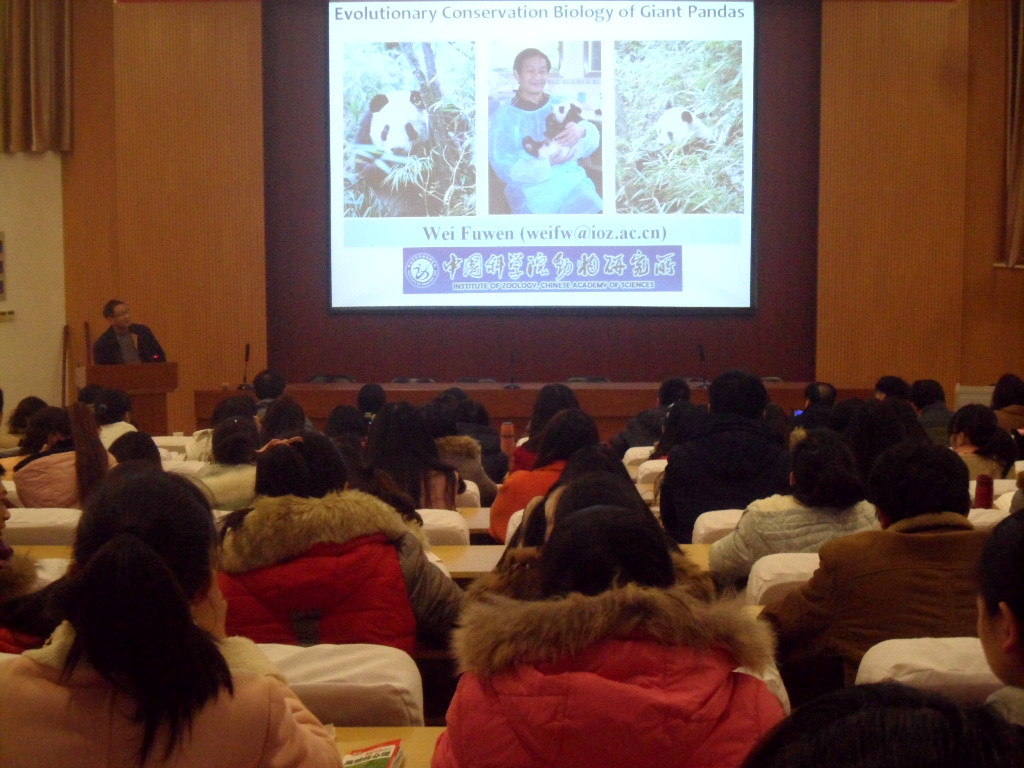 12月10日下午,应生命科学学院邀请,中国科学院动物研究所研究员魏辅文在生物报告厅作了一场主题为“大熊猫进化保护生物学研究”的学术报告。生命科学学院相关领导、教师代表、研究生、本科生等百余人参加了此次报告会。报告会由生命科学学院副院长李景原主持。