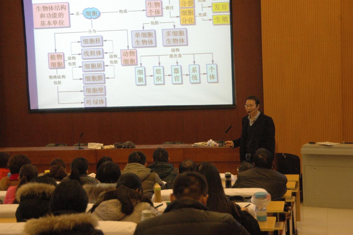 李高峰教授围绕“中学生物教学策略——师生互动教学”与“概念图教学”两大主题,将中学生物教学为学员们进行了详细的阐述。第一场报告中,李教授从“角色扮演法”、“模拟游戏”、“科学探究”、“体验法”、“实验法”、“模型法”等七个方面,向在场老师介绍了初中生物教学方法。第二场报告中,李教授则通过对概念图教学、初中生物学前科学概念教学及开发和利用课程资源的讲解,阐述了中学生物教学的相关内容。